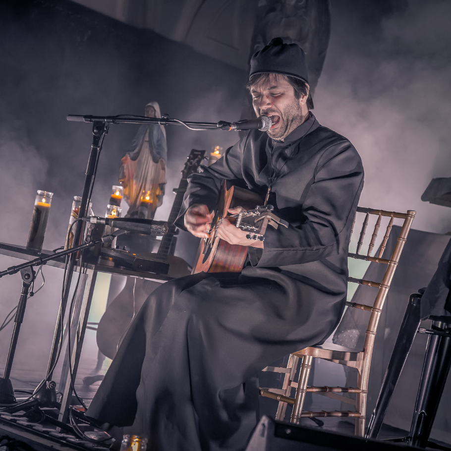 Les fidèles qui se seront massés devant l’ex-Colocs auront le bonheur d’entendre une divine sélection de chansons relativement récentes et de vieux airs onclesques rarement chantés sur scène, le tout ponctué de sermons enflammés et de truculents mots d’église.